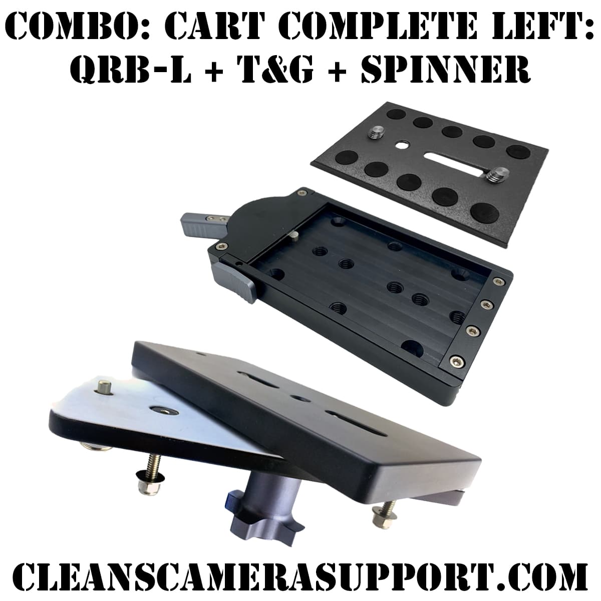 Combo: Cart Complete Left is the full rotating cart system built around the QRB-L, the mirrored quick release base that keeps yer right hand on the camera while the left hand releases the plate. Add the Spinner underneath and now yer camera also rotates 360 degrees on the cart. Left-hand release, full rotation, $90 off the three pieces bought separately. This is the setup.