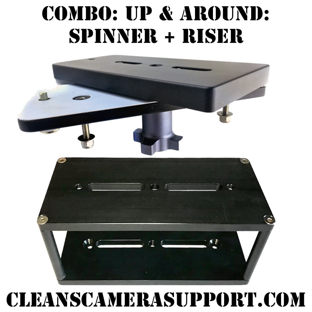Combo: Up & Around is for the AC who already has the plate sorted. You’ve got a Clean’s QRB, or any compatible quick release base, and now you want the cart system underneath it. The Riser goes up. The Spinner goes around. Together they take whatever you’re already running and turn it into a fully elevated, fully rotating camera cart setup. One order, one bundle, $55 off buying the two pieces separately.